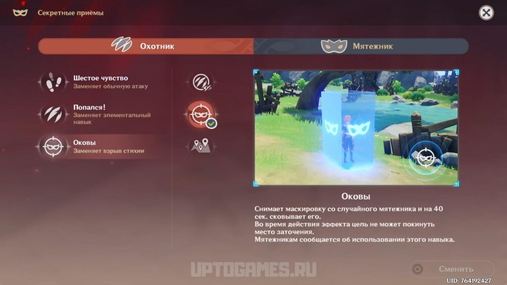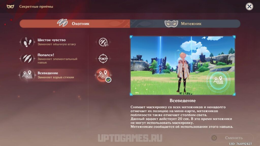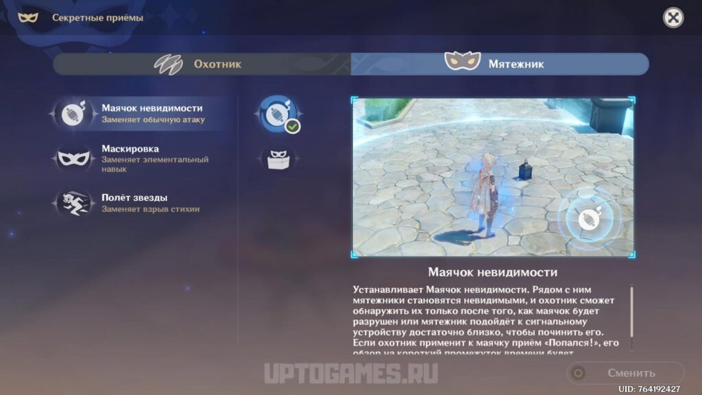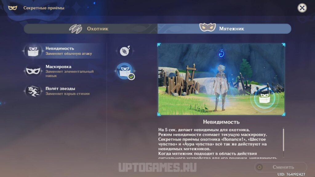 - Маскировка: Короткое нажатие — маскирует мятежника под случайный объект локации. Длинное нажатие — снятие маскировки. Пропадает при парении/плавании.