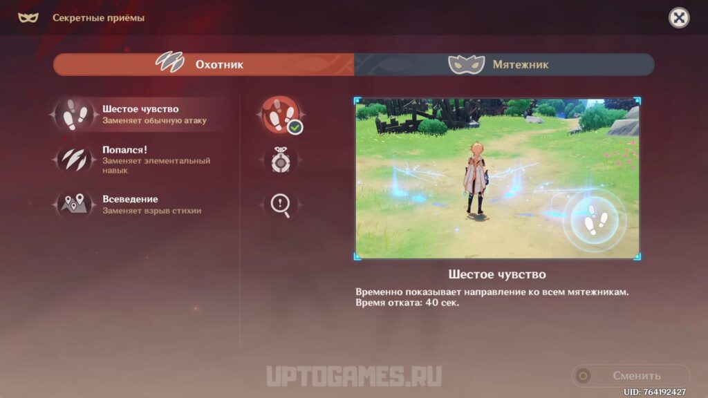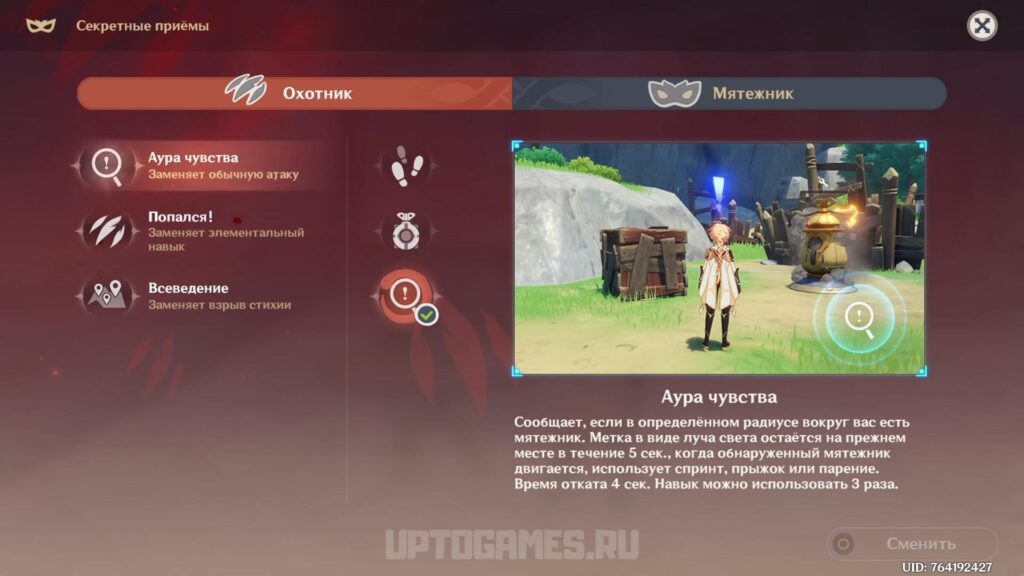 - Аура чувства: определяет присутствие мятежника рядом и отмечает его недавнее местоположение. Время отката 4 сек, можно использовать 3 раза.