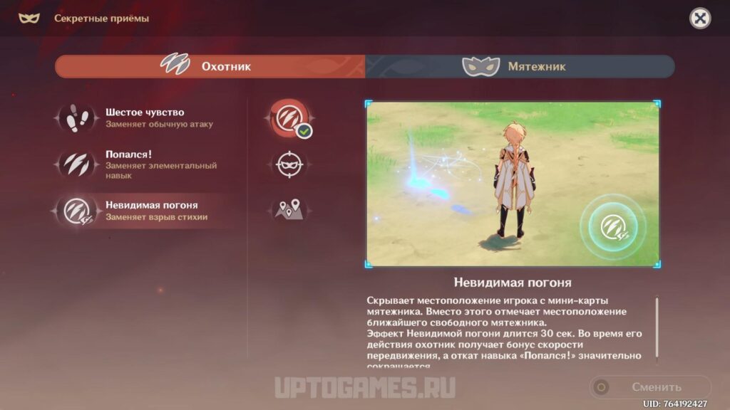 - Невидимость: делает мятежника полностью невидимым для охотника на время. Секретные приёмы охотника всё так же действуют.