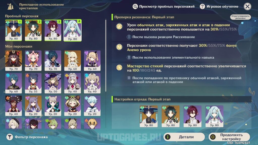 Совет по отрядам — в каждую из команд берем по 2 из 4 пробных Анемо. Добавляем своих