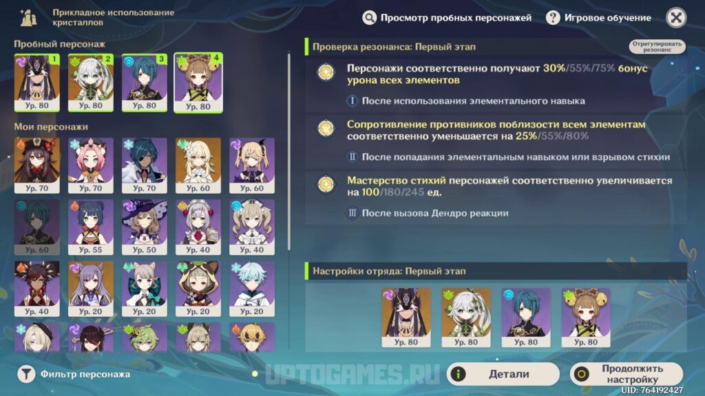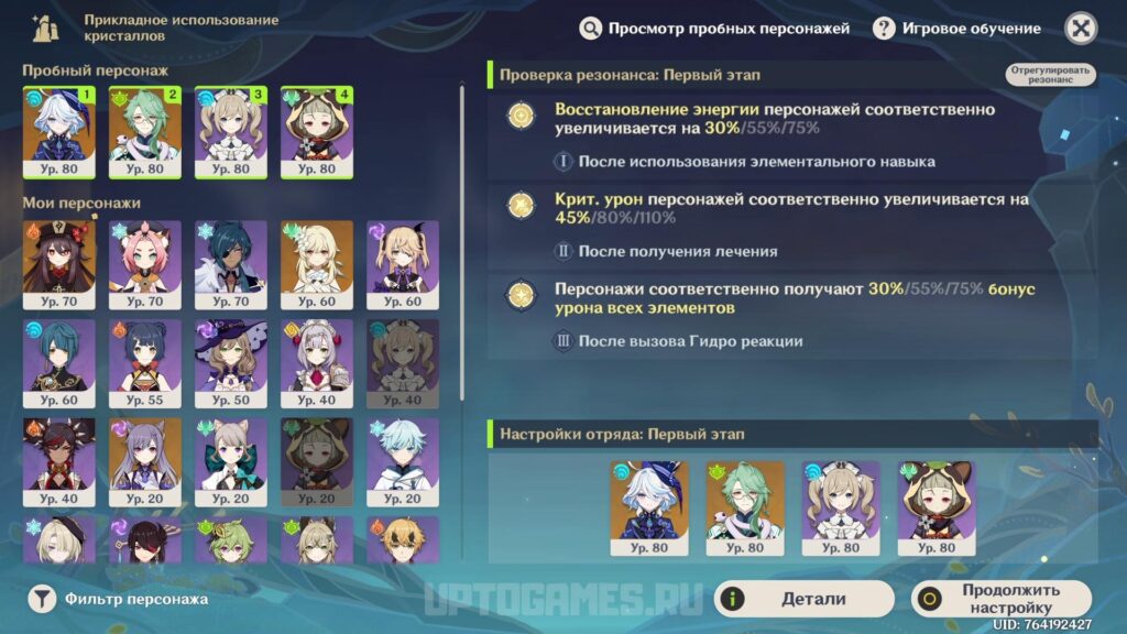 Совет по отрядам: Комбинируйте хилеров (напр. Барбара, Коллеи), Гидро персонажей (напр. Синь Цюй, Кэйя) и дамагеров, усиливающихся от лечения (напр. Сахароза, Лиза). Также добавьте героев поддержки по необходимости (напр. Фурина, Бай Чжу).