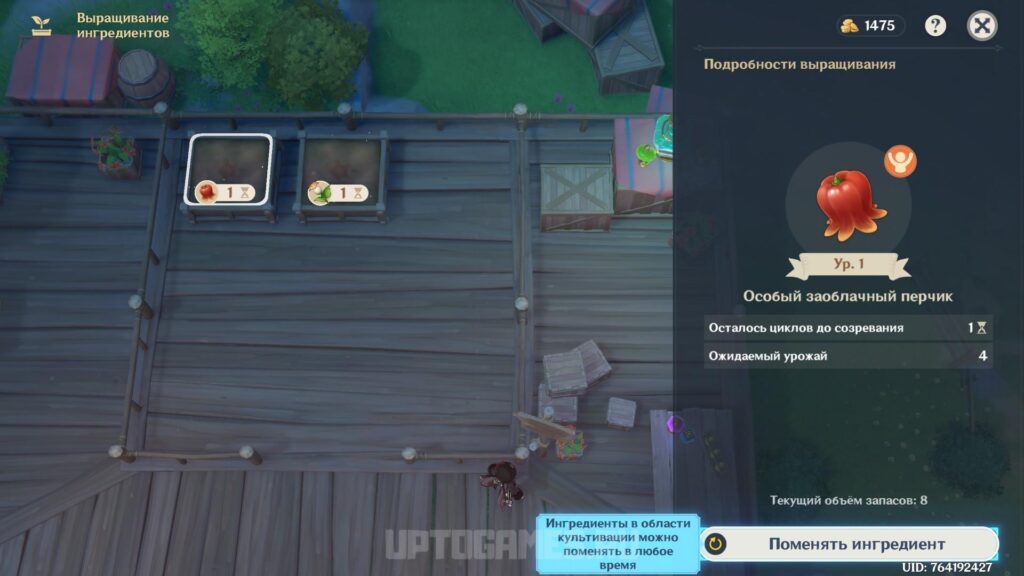 Чтобы сменить выращиваемый ингредиент Вам необходимо выбрать грядку и растение на которое Вы хотите заменить на другое. После нажатия на кнопку «Поменять ингредиент» — выбрать новый ингредиент и подтвердить замену.