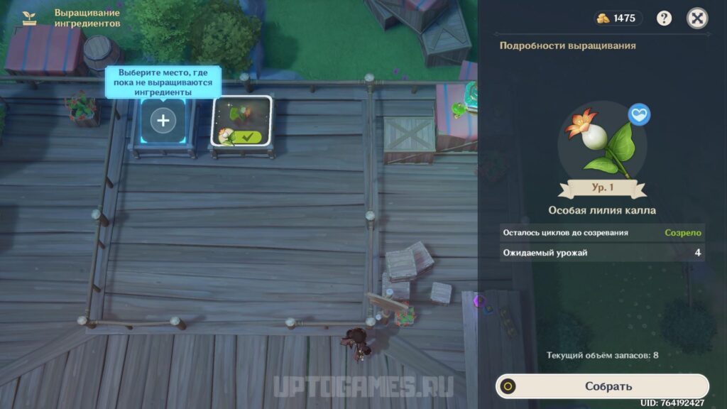 Чтобы посадить ингредиент нам необходимо зайти в интерфейс используя кнопку «Выращивание ингредиентов» которая доступна около зоны с грядками. Далее выбираем грядку, которую будем использовать, а также алхимический ингредиент, который мы и хотим вырастить. Подтверждаем выбор кнопкой справа снизу экрана.