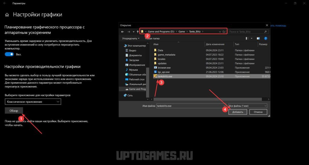 3. Найдите файл «tanksblitz.exe» в папке с игрой (например, C:\Games\Tanks_Blitz) и добавьте его.