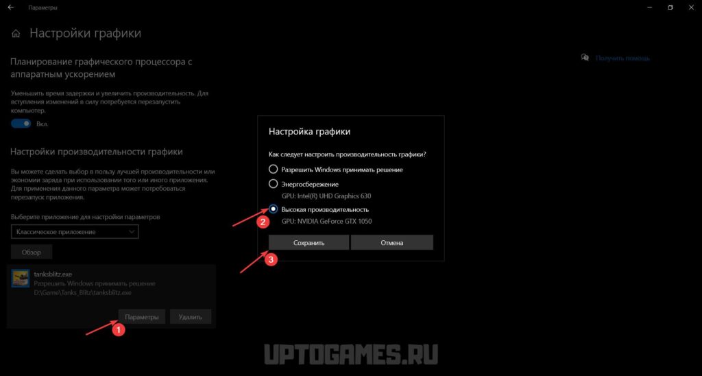 4. Выберите «Параметры» для добавленного файла и установите «Высокая производительность».