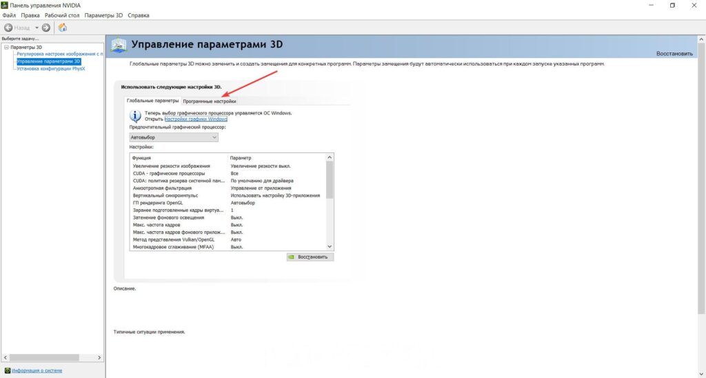 - Переходим в «Управление параметрами 3D» -> «Программные настройки».