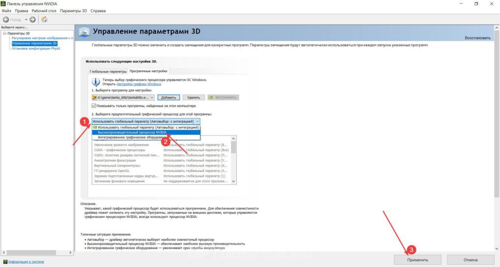 4. Выбираем «Высокопроизводительный процессор NVIDIA» (даже если система считает, что встроенной графики достаточно).